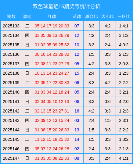 双色球第2025147期开奖:红球:01、03、05、08、22、33;蓝球:08。其中大小比为2:4,质合比为3:3,三区比为4:1:1。
