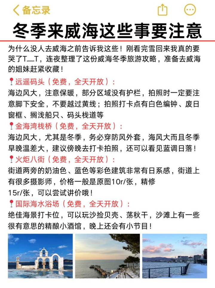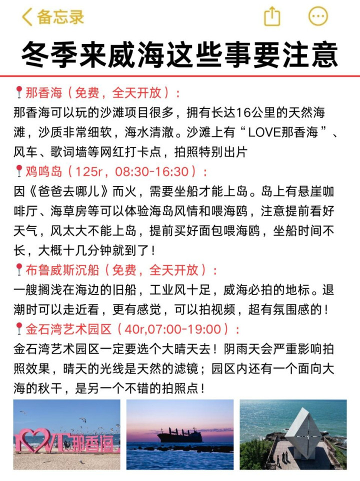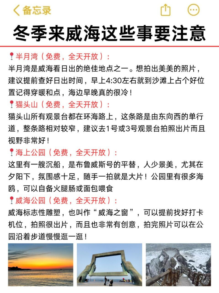 去威海玩行程至少留2-3天📅!海岸线真的特别长,慢慢逛也是需要一点时间的⏰~不需要花钱坐观光船🚢,景点都在海岸线上,可以自驾🚗游览,非常方便,晴天去观景台或者环海路都可以拍到美美的照片📸!