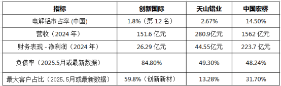 优势:成本控制(低电价)、产业链一体化(自给率>80%)、高净利润增速。劣势:整体市占率较低。CRU数据显示,按2024年产量计,创新国际为中国第十二大电解铝生产商,仅占据约1.8%的市场份额。2024年,前五大电解铝生产商合共生产约2000万吨,占据约46%的中国电解铝总市场份额。