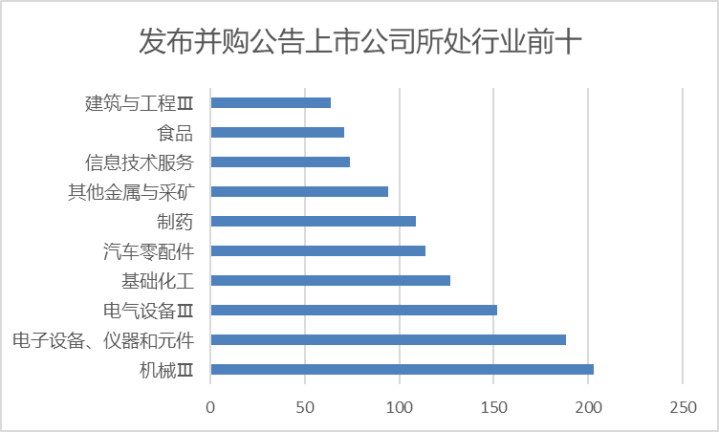 交易标的所属行业数量前十的行业依次为工业机械、电子设备、多领域控股、基础化工、电气部件与设备、信息科技咨询与其他服务、互联网软件与服务、电子元件、金属非金属、商业和专业服务。