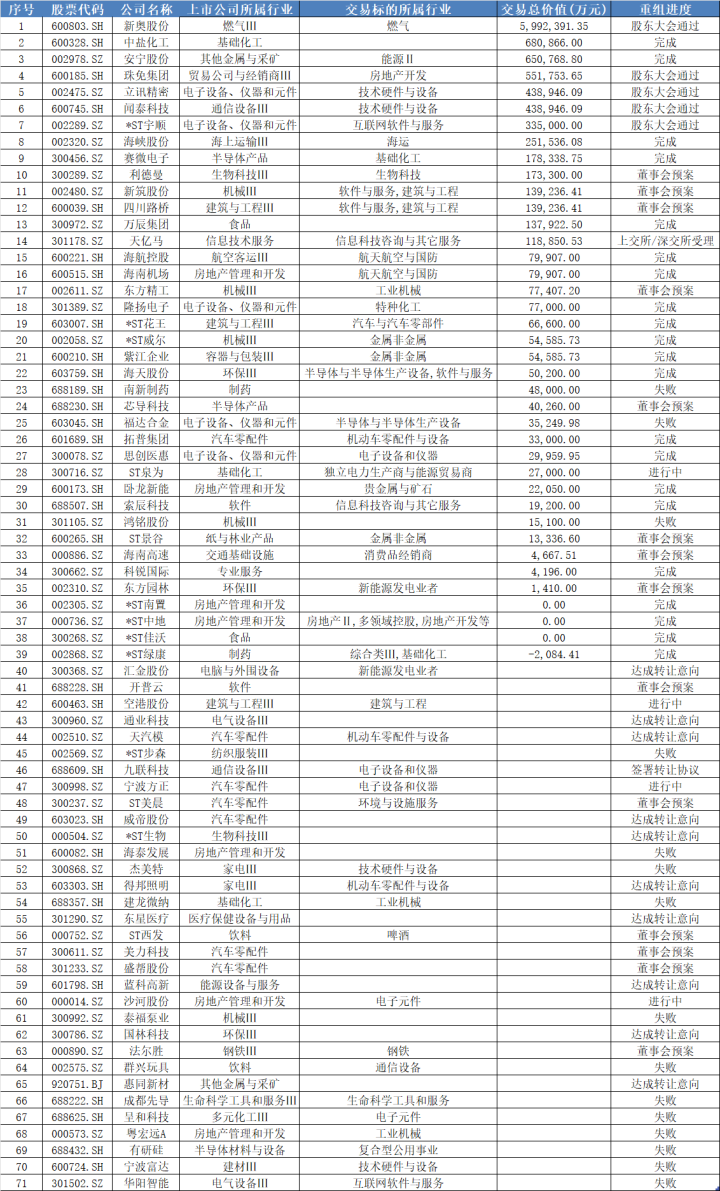 界面新闻统计梳理发现,今年71桩重大并购重组案例中,有近半数为跨界并购,涉及能源、房地产、科技等多个领域,典型案例包括主营生态工程建设的*ST花王(603007.SH)作价6.66亿元跨界收购汽车与汽车零部件企业尼威动力。还有十余家企业进行产业链资源整合型并购,包括新奥股份(600303.SH)子公司私有化新奥能源(02688.HK);主营钒钛磁铁矿采选等业务的安宁股份(SH688175)65亿元收购经质矿产。